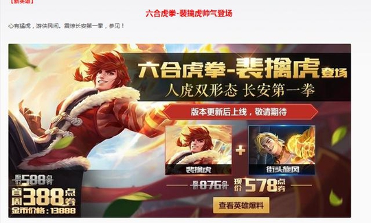 2.王者新英雄裴擒虎登场,首周售价388点券,这个是官方给出的折扣价哦~