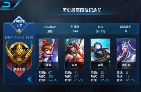 之前打到星耀二然后两轮连败掉到星耀四0星0积分,看了战绩其中赢的几场全是大乔贡献的,于是仔细思考了一下大乔的铭文、出装、技能使用、以及非坦克类辅助的玩法注意点,然后只用大乔上分,结果一路高歌猛进,打到王者。大乔这个赛季的胜率也从赛季初乱玩的41%上升到61%,下面全面说说大乔的玩法。