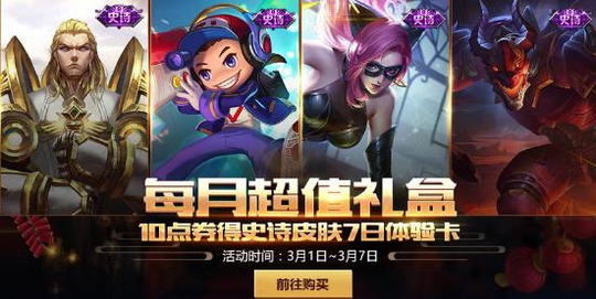另外王者荣耀在版本更新后同步开启史诗皮肤体验卡活动,只需要10点券就能够获得以下史诗皮肤7日体验卡一张。