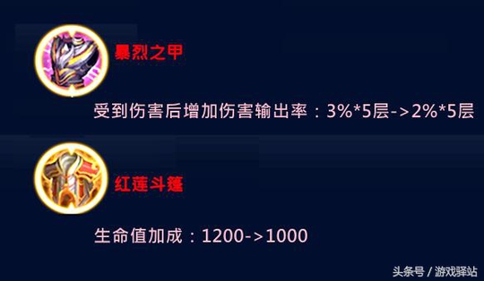 这次更新削弱了两件装备,分别是红莲斗篷和暴烈之甲,其中红莲是大多数坦克的标配装,这次下调200点生命值也间接削弱了坦克型英雄前期的抗伤能力,而暴烈之甲的伤害输出率被削减1%后同样影响了一批英雄,比如关羽!