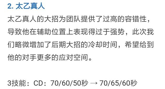 天美同样看不下去这个骑着火炉怪的家伙了,复活甲的改动使得太乙的大招十分变态,而且后期cd短,打团容错率太高了,这次体验服加了太乙大招的cd,算一个小削弱吧!