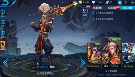 韩信的教廷使者这款皮肤是钻石夺宝来获得,也算是一个免费的皮肤了,对于喜欢韩信的小伙伴也算不错的福利语音台词也是独立的。