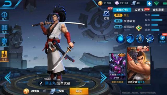 宫本的霸王丸是snk授权的所以也是免费,这款皮肤也是挺良心的,语音特效都是新的虽然语音听不懂说什么,而这款皮肤可是18888英雄里的唯一一款免费的皮肤了,是要感谢snk还是要感谢天美呢。