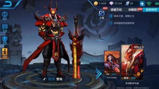 曹操的烛龙是属于赛季奖励皮肤,只要达到黄金累计胜10场都可以获得,每个赛季都有应该小伙伴都领到了吧。这款皮肤可不比那款死神来了的效果差哦。