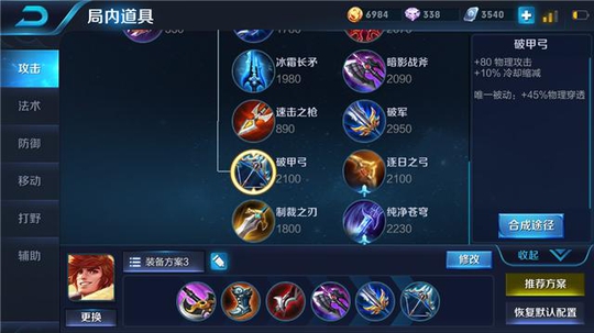 裴擒虎出装: 巡守利斧+急速战靴+泣血之刃+暗影战斧+破军+破甲弓