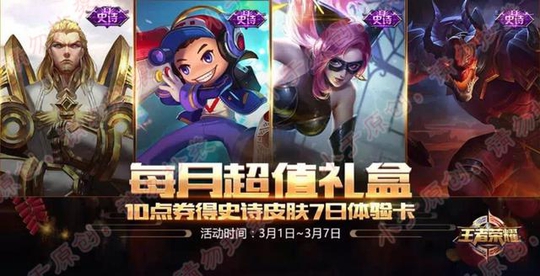 然后第二个活动就是明天上线的每月超值礼盒;1元可以获得一个2888史诗级皮肤四选一的7天体验卡~现在的每月超值礼盒没有刚开始的2个皮肤碎片了...