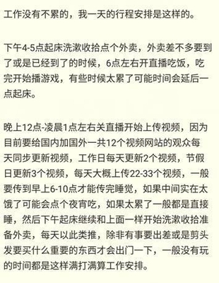 晚上12点-凌晨1点左右关直播幵始上传视频,因为目前要给国内加国外一共12个视频网站的观众每天同步更新视频,工作日每天更新2个视频,节假曰更新3个视频,每天大概上传22-33个视频,一般要传到早上6-10点才能传完睡觉,如果中间实在太饿了可能会点个夜宵吃,如果太累了一般都是直接睡,然后下午起床继续和上面一样开始洗漱收拾准备外卖,每天以此类推,除非有事要出差或是剪头发要买什么重要的东西才会出门一下,一般没有玩的时间都是这样满打满算工作安排。