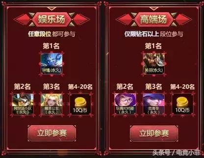 此次活动奖品非常实在,娱乐场第一名可获得钟馗永久英雄,随后是阿尔法小队,精灵公主永久皮肤。高端场可获得关羽英雄,安其拉和李白永久皮肤,这次获得考验的是大家的技术了。