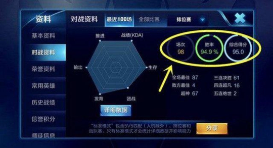 可以看到这个大神的排位98场就上到王者,胜率94.9%,综合得分高达95。而且其中有67场超神,三连决胜61场,全场最佳MVP87场,这样的数据表示真的佩服。