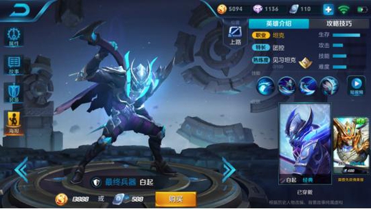 最近看玩白起的人不是特别多了,不过这个英雄的持续作战能力和抗击打能力还是很强的,普通攻击会使得来自对方英雄的伤害降低,一技能还可以恢复生命值,同时兼具嘲讽和减速技能,这样的英雄是典型的团战搅屎棍,遇到他你可要小心点哦。