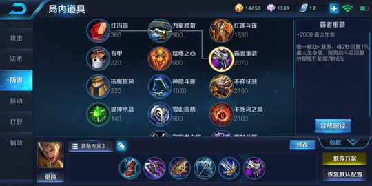 出装方面可以按照上图的,当然,这并不是唯一的出装路线,这只是个人的意见而已。这套装备有CD冷却,可以让亚瑟的技能CD更加的短,加上这里的进攻装,程咬金都可以秒掉。