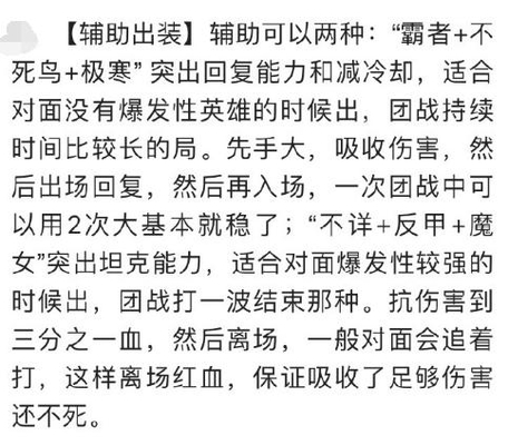 出装方面有两种。第一种是辅助型:霸者重装+不死鸟之眼+极寒风暴突出回复能力和减冷却,适合对面没爆发性英雄出。先手大让对手疯狂输出。不祥征兆和反甲+魔女斗篷突出坦克能力,适合对方爆发性较高适合出,主要为队友抗伤害和打持久战。