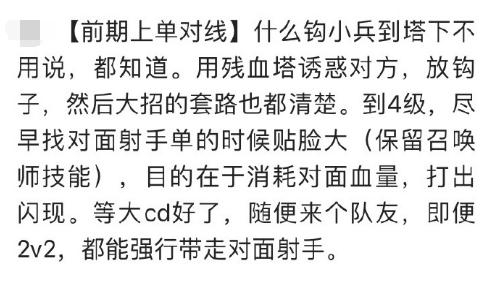 首先作为坦克战士,大多数英雄都是用他打上单,技巧就是用残血塔诱惑对方,放钩子把对方钩到自己的塔里。到了4级尽量找到对方的脆皮,贴脸放大一顿输出,目的在于消耗对方血量压制对方发育,能达到gank更好。遇到很强的对线组合,可以猥琐一点静待时机。