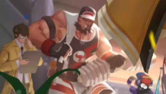 海报左下角是身着屎黄色风衣的诸葛酿、正在举哑铃的程咬金和短腿小鲁班。等等,程咬金居然脱掉了爱与正义、穿上白黑红三色的运动装?这是不是暗示未来要出运动风的皮肤?