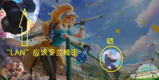 隐藏的剧情想必肯定是十分狗血了,这里我们可以看到,图片正中的那个美男子想必就是铠了(基本上就他符合这个相貌了)而比铠更显眼的明显是花木兰旁边的大手,这双手是谁的呢?从手套的“LAN”字样来看应该是兰陵王了,名称的缩写也符合兰陵王的姓氏。