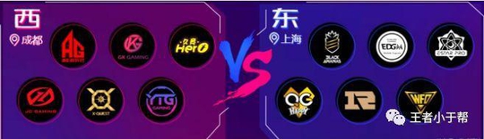 春季赛一共12支战队参赛,目前东西分组名单已经确定,东部赛区(上海)有QGhappy、eStarPro等六支战队,西部赛区(成都)有JC、AG超玩会等六支战队,具体战队如下图所示: