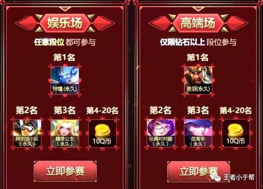 第一个活动是王者荣耀和企鹅电竞联合推出的裴擒虎争霸赛,活动持续到3月13日,仅限手Q区玩家参与,比赛分为没有段位限制的娱乐场和仅限钻石以上段位参与的高端场,前者的排名条件为击杀数,后者为KDA评分值。而玩家只需用裴擒虎参与比赛赢得胜利即可!