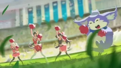 原画远处还可以看到一个啦啦队,队员很神奇,3个萌妹子大乔、小乔和大小姐和一个萌宠梦奇,梦奇不应该是啦啦队成员应该是吉祥物吧,长这么大跳起舞跳啦啦操有点吃力吧。