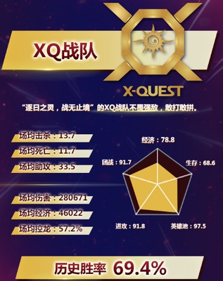 XQ战队是上赛季的亚军,实力肯定是非常之强的。官方认为他们的团战分在这几个战队里面是最高的,说明XQ战队在团战中非常善于把握机会和节奏。而moba游戏,大家都知道。团战是胜利的根源,无论有多么劣势或者多么优势,只要一波团战就能改变整个结局。XQ的团战打得好,所以他们的战绩也很出众。