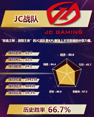JC战队在上赛季的表现也非常精彩,长期处于小组赛的头名,这个队伍就胜在非常稳定。加上有纵情的强大带节奏能力,别人不敢用的韩信他都能用的出神入化,在KPL比赛里面也打出了自己的一番天地。