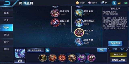 暴烈之甲:提供护甲和生命值。被动既能加移速也能加输出,对于位移不足容易被风筝的白起有比较好的补强作用。