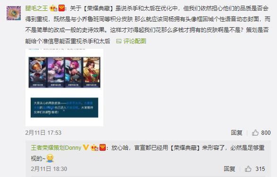 而对于大家吐槽的武则天,策划也连表示该改改,对于荣耀典藏皮肤的翻新也会足够重视。