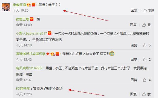 打电话问客服了,客服说官博和他们是一个信息渠道,现在既没有黑猫返场消息,也没有拳王不返场消息,还是得看游戏里的通知。客服小姐姐说他也不懂为什么官博那么说,看来抠脚妲己要被扣鸡腿了。返场大家也不会买元党和达摩的勇者皮,又贵又难看,都在等返场呢。还不如放出来让大家都开心一下,你们也能挣到钱对吧!