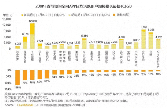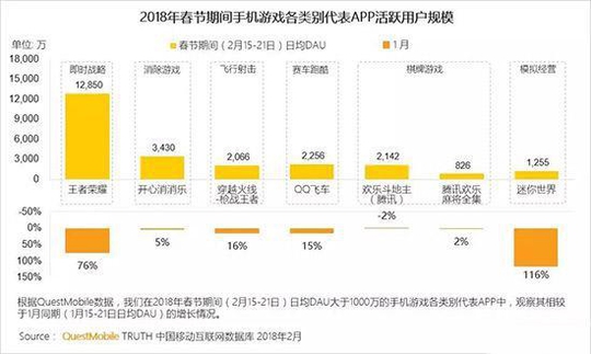 在QuestMobile报告中,《王者荣耀》在春节期间日活跃人数几乎翻了一番,日活跃人数与1月份相比增长了76%,达到恐怖的1.28亿人。