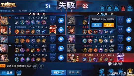 从上图来看,这一场比赛红方获得了很大的优势,虽然小浪浪的韩信表现也是十分逆天,在数据上应该是碾压全场,全队十八个人头,居然有16个是和韩信有关的。