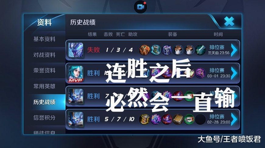 这是游戏中一个再正常不过的规律,当你出现连胜后,你会被默认的归入大腿序列,全场就会交由你自己carry,而匹配到的队友往往是被打上连败或者是战绩不佳标签的人,这时的你在对局中是非常被动的,所以尽量不要把把都做MVP,适当输两把也不是坏事!