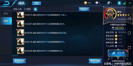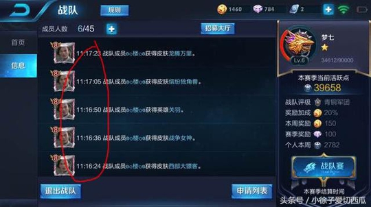 在同一个战队当中,只要有玩家获得了英雄或者皮肤的时候,就会在战队信息当中展现。我们可以看到这个玩家一分钟之内获得了两个英雄和三个皮肤,这其中有两个是2888点券的皮肤。这还不是关键,关键是这个玩家在5分钟之内用点券将商城当中自己没有购买的英雄和皮肤全部都给购买了。