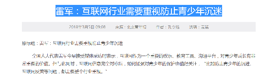 其中,全国人民代表雷军的建议值得我们深思。在媒体采访中,雷军表示,互联网对青少年成长有非常重要的价值。但如何加强对青少年的保护,比如防止青少年的沉迷、互联网反黄等问题,都需要整个行业重视!
