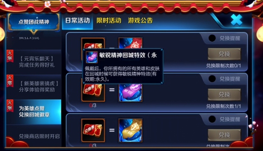 点赞精神回城特效兑换开启,有三张兑换票的小伙伴记得进行兑换,光特效而言,红色的掌控回城特效应该是较显眼好看一些。