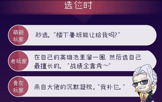 首先就是玩家们选英雄的时候,就会有一些很明显的不同了。比如说,在选英雄的时候一般新手玩家是更喜欢秒选的,而且新手玩家们对于鲁班七号这个英雄往往是情有独钟的。所以说经常会因为选英雄而掐起来。你这么做的话一看就是菜鸟喽!但是老牌选手就不一样了,老玩家们一般都会先看一眼自己的英雄池,然后选择自己最喜欢的英雄或者是最厉害的英雄,然后一路开始秀。而骨灰级别的资深玩家就更淡定了,对于他们来说,补位就好了。