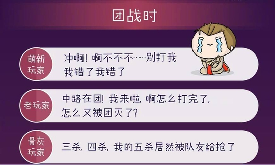 团战的时候,这三个类型的玩家也是完全不一样的反应。新手玩家一般会比较懵逼,反应也比较清奇,而老玩家们的话,反应就比较淡定了,团灭什么的也就看看而已了。至于骨灰级别的玩家,他们关注的早就不是团灭的问题了,而是如何去团灭对面,如何拿到五杀这个东西,对于骨灰玩家来说,五杀被抢才是最不能忍的。