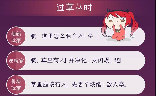 过草丛的时候,也是很考验玩家们游戏意识的时候,说真的在过草丛的时候,新手玩家估计都是被对面的给杀死,至于老玩家,一般会有一点游戏意识,至于骨灰级别的老玩家,这样的老玩家应该是没有人能够从草丛里面蹲到他们的,反而是在草丛里面蹲到一波对面的玩家。
