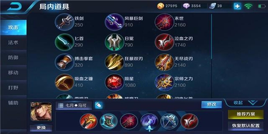 贪婪之噬:即三级打野刀,但是二级打野刀的性价比更高,只需要750金币就可以通过打野达到30%攻速,还可以提高马可前期的刷野效率,快速发育。所以前期只需要出二级打野刀即可,到了后期再补出三级打野刀。