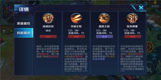 马可波罗向指定方向连续射击,每一枪都可以触发普攻的法球效果,命中回复能量。攻速影响射出的子弹数目,攻速为0/75/150时子弹数为5/7/9。