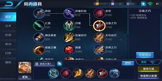 泣血之刃属性为100点物理攻击,25%物理吸血,让后羿站桩输出时能凭借高吸血能力及时回起血量继续打出伤害。(敌方回复能力强,有貂蝉,蔡文姬等英雄,选择制裁之刃限制敌方回复效果)
