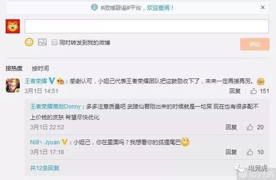 在中国青年网的这条微博下,王者荣耀官博也前来表示:“感谢认可,小妲己代表王者荣耀团队把这鼓励收下了,未来一定再接再厉。”