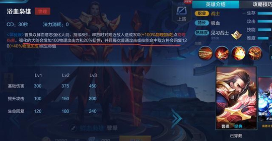 曹操回血的特性靠打人来实现,可以说曹操的回血特性是最霸气的,揍人的同时还回复血量你说气不气。