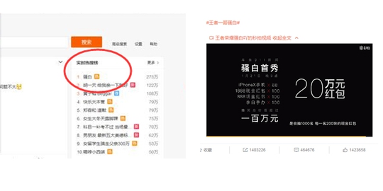 最厉害的还是在新浪微博,骚白创造了奇迹般的举动。在微博热搜不到十分钟登上了第一,还有他的一条微博一小时不到转发评论点赞高达百万!