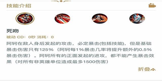 整体分析:这个被动技能是阿轲的技能特性根本,从背后必定暴击的技能特性注定她是一个必须要有足够暴击效果才能打出伤害的英雄。