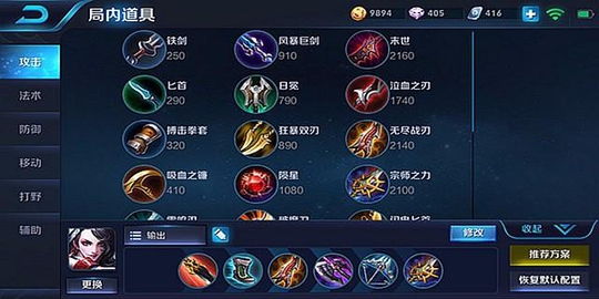 打野刀前期能够帮助快速刷野,到四级后抓人,升级为追击刀锋可以拥有寒冰惩戒,帮助阿轲快速留人,此时不建议升级到三级打野刀。抵抗之靴能够帮助阿轲在切入团战时不容易被控制后集火秒杀。无尽战刃是阿轲的核心装备,提供了极高的暴击效果,帮助阿轲的背后暴击伤害更高。暗影战斧是切后排的核心装备,提供了高额的减cd和护甲穿透帮助阿轲对脆皮的杀伤力更大。破甲弓提高了对前排坦克的输出,出完破甲弓以后的输出就极为爆炸了。最后一件装备可以看局势选择出宗师之力还是破军,因为宗师之力的强击被动能被阿轲的一二技能触发,提供的8%移速也可以帮助阿轲快速追击敌人,而破军则使阿轲对残血的收割能力更加出众。