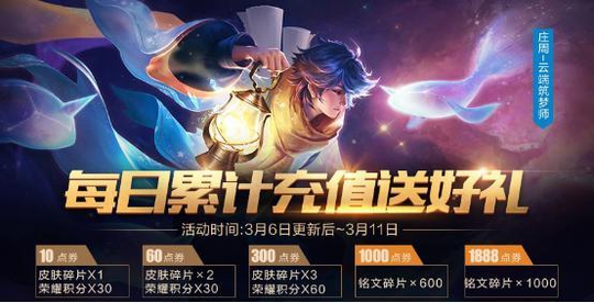 充值活动再次回归,累计充值送皮肤碎片与铭文碎片,荣耀积分可抽点券夺宝。