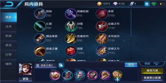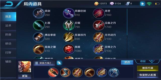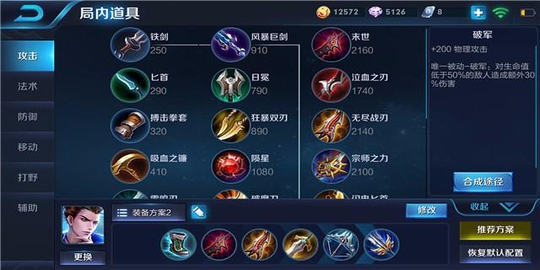 装备推荐:追击刀锋+急速战靴+无尽战刃+吸血之镰+宗师之力+破甲弓。孙悟空选择打野路线发育可以更加迅速,装备成型较早,可以在前期就打开局面,所以选择追击刀锋,提高打野效率,增加攻速,为大招触发印记伤害做准备。后期吸血之镰可以看情况选择合成泣血之刃或者制裁之刃。