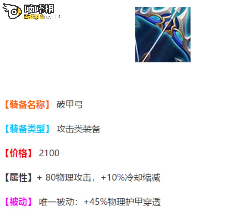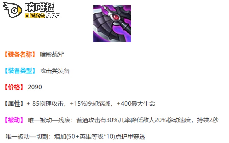 攻击武器,最大特点是:护甲穿透很高,+45%物理护甲穿透;+80攻击;+10冷却缩减。