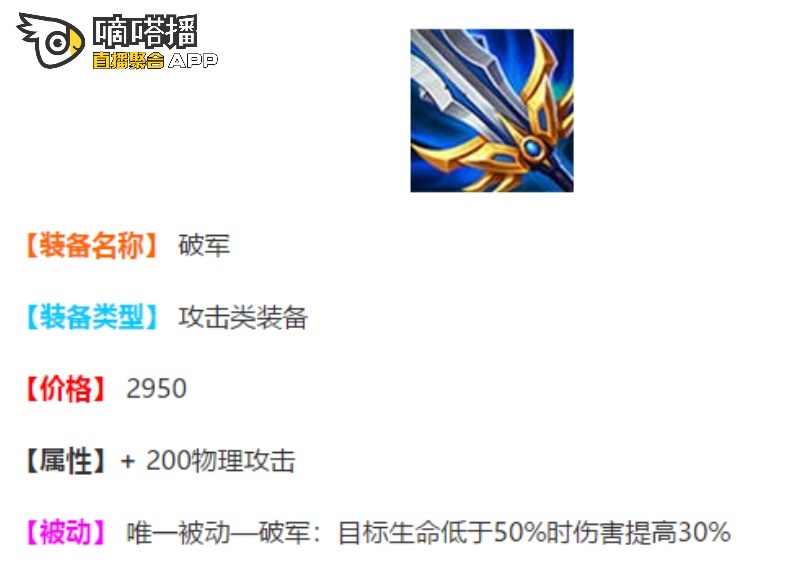 攻击武器,最大的特点是:攻击力加成爆炸,+200攻击;被动对残血敌人伤害增加。