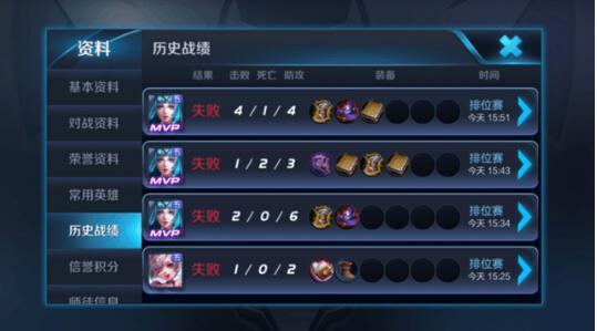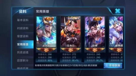 常用英雄中前几位平均场次差不多都在100场左右,胜率全都在95%以上,场次并不算多,如果是高手练个小号的话,只用一个英雄从青铜开始打到王者倒没什么问题。