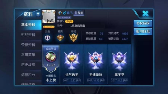 先来看看这位玩家的资料,4700多的场次中获得7400多次的赞,英雄76个,皮肤136,拥有五个赛季的王者印记,按照王者的赛季周期,推测是一年开始玩,应该是为又有钱又有闲的土豪玩家。